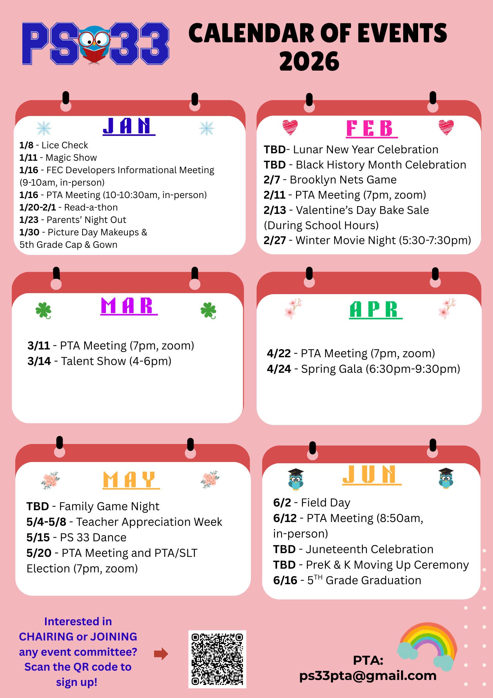 Every parent, guardian, and teacher at PS 33 is a member of the PTA! Get involved and help make our school community thrive! Click here to learn more.