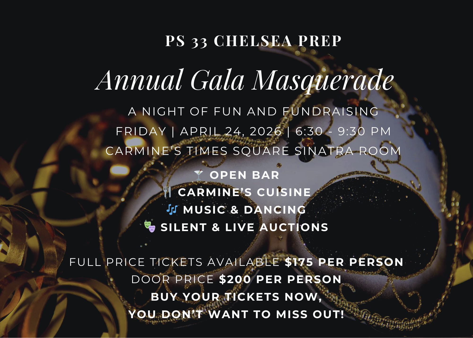 The PS 33 Gala is our biggest fundraising event of the year and a true celebration of our school community. Parents, teachers, and friends come together for an evening of connection, entertainment, and generosity—all in support of our students. Buy tickets today!